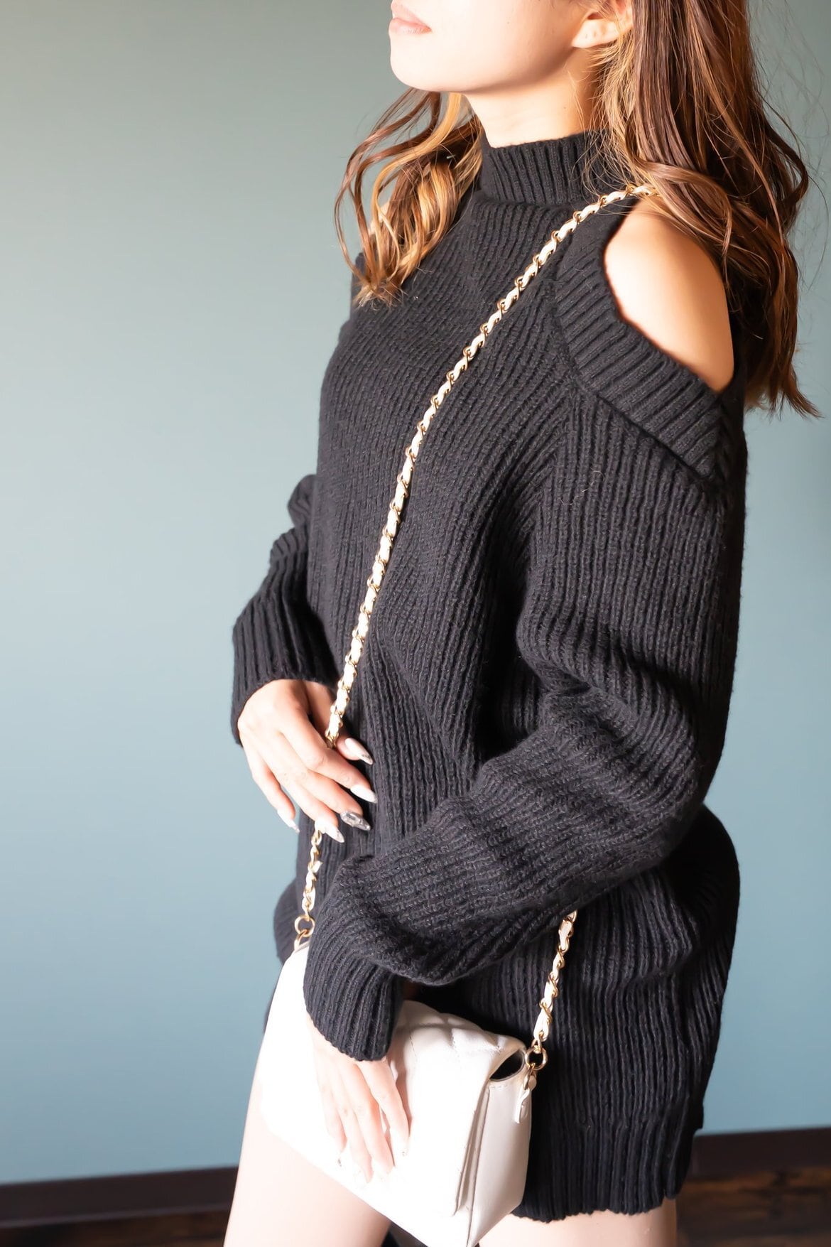 今季のトレンドを取り入れた、ショルダーカットデザインのリブ編みニットワンピース。