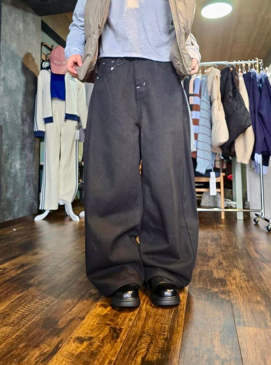 バックデザインが印象的なブラックワイドデニムです。リラックスしたシルエットながらも、洗練された着こなしを実現。さまざまなトップスと組み合わせて楽しめるアイテムです。