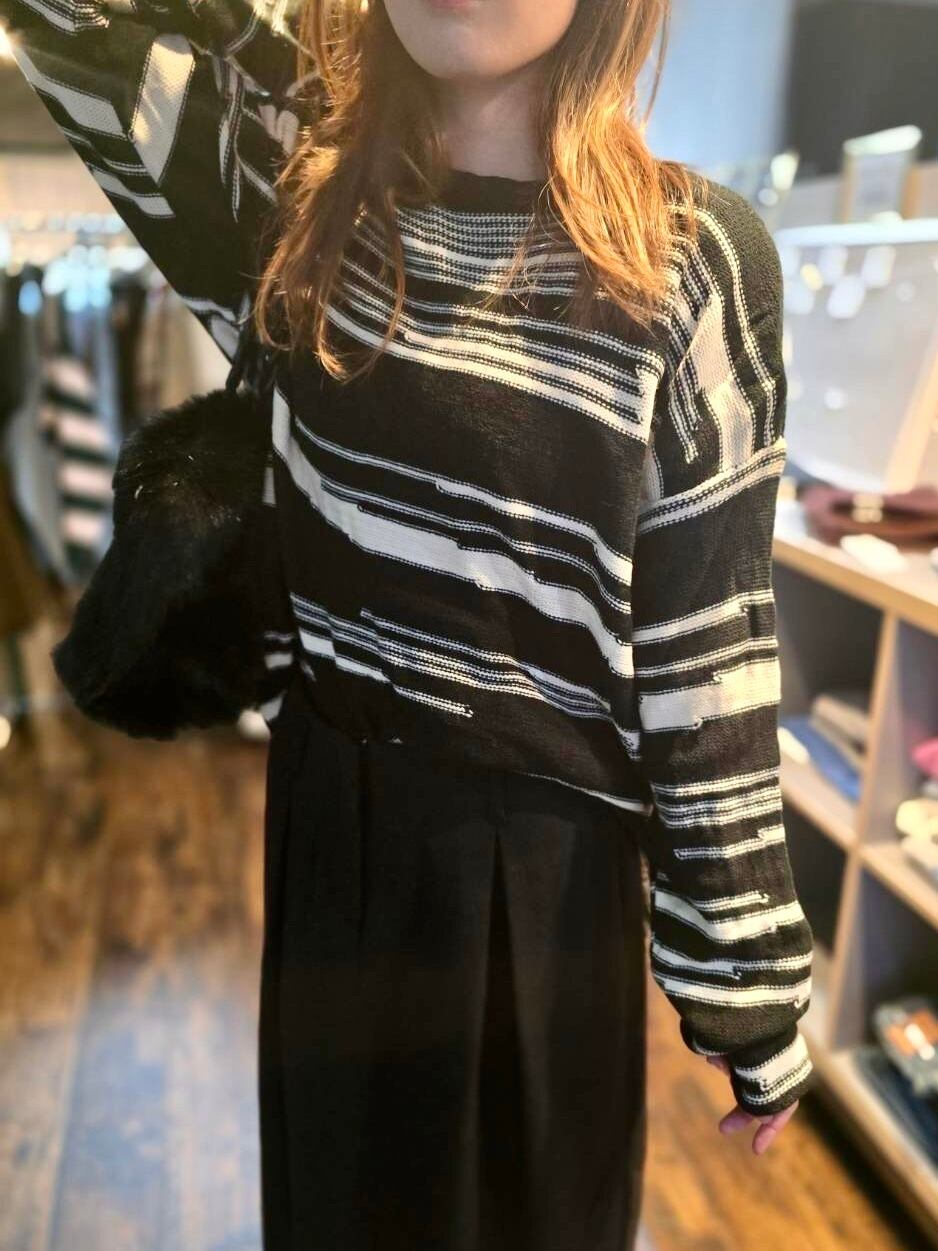 トレンド感溢れるアートボーダーデザインが特徴的なルーズニットです。ゆったりとしたシルエットで、リラックスした着心地を提供します。デイリースタイルにさりげない個性を加えてくれます。モノトーンコーデも暗くなりすぎず、薄手で着膨れしないので様々なアウターに合わせられます。若い世代から大人女子まで幅広く使え、親子でシェアできます!