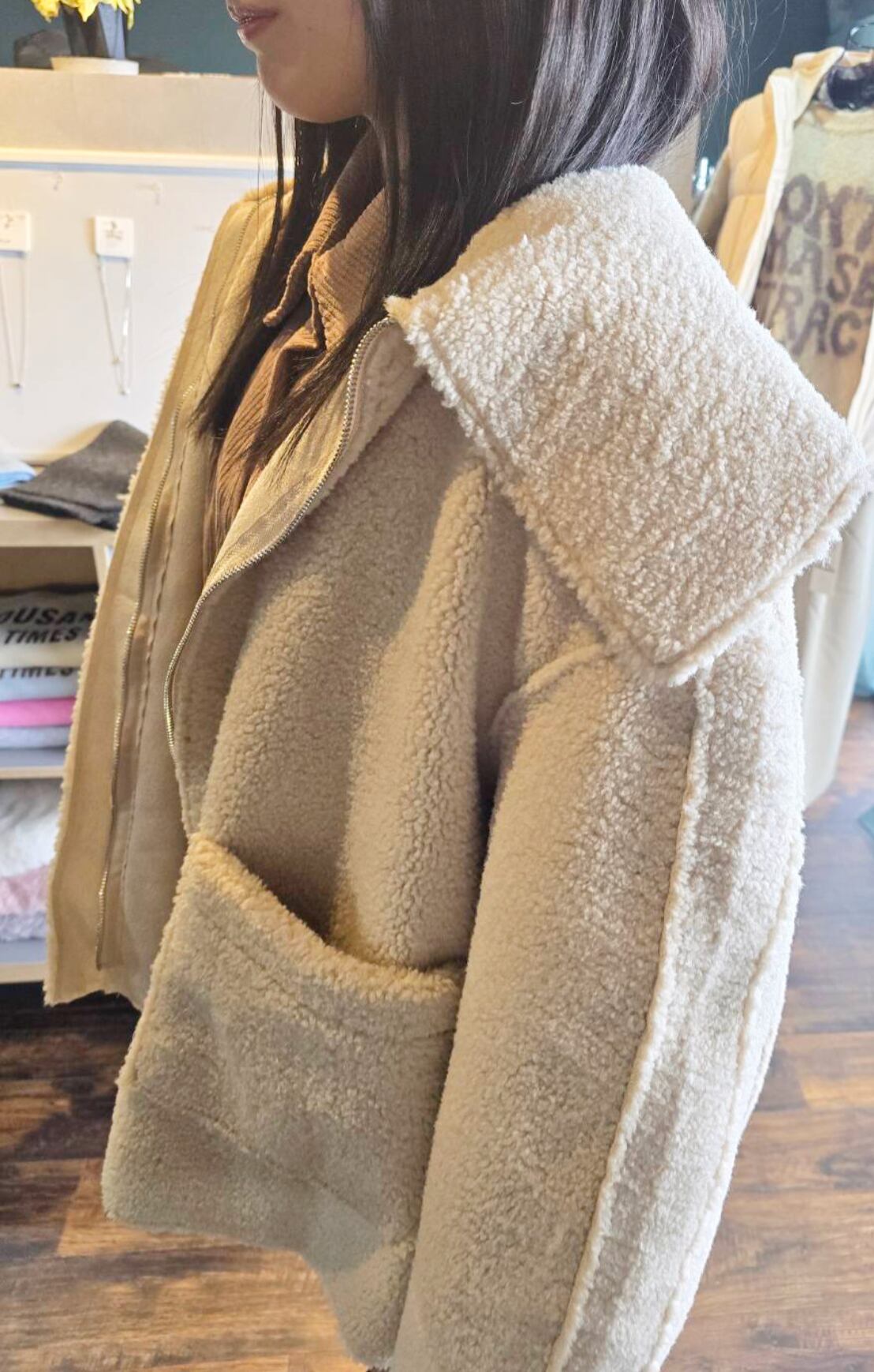 全体的にゆったりとしたデザインで、動くたびに可愛い。プードルボアの肌触りが心地よく、店舗のスタッフにも好評です♪