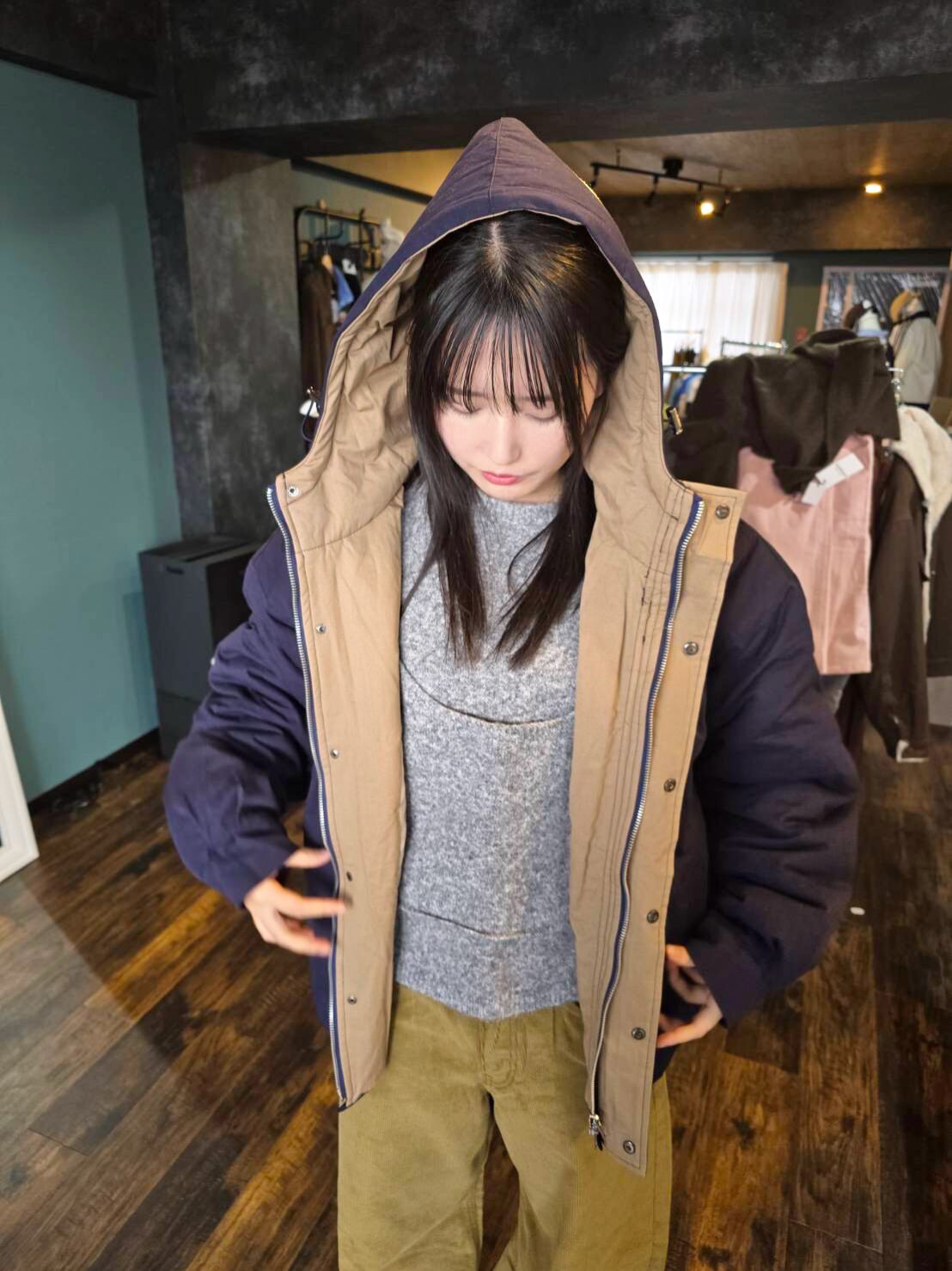 季節感満載のウィンター配色フードジャンパーです!落ち着いたツートンカラーが魅力で、寒い季節にぴったりです。裾が絞れるため、丸みを帯びたシルエット(ベージュ画像参照)スッキリストレートなシルエット(ネイビー画像参照)ふた通りの着こなしを楽しめます。なお、こちらは少量入荷のため、オンラインショップでの販売は各カラー1点のみとなります。