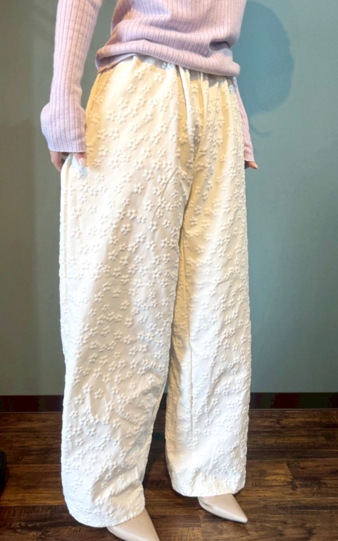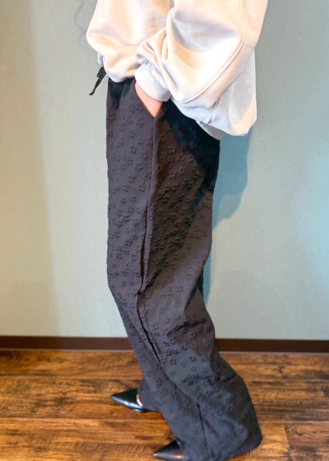 エンボス加工のフラワーデザインが魅力のパンツです! ゆったりとしたシルエットと軽やかな素材感が特徴で、春のコーディネートにぴったりなアイテムです。カジュアルながらも華やかな印象を与えてくれます。
